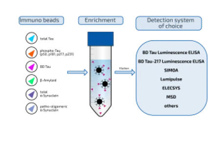 Our Neuro IP Kit enables easy enrichment of the neurodegeneration-relevant proteins total Tau, different phospho-Tau´s (p50, p181, p217, p231), brain-derived Tau, beta-Amyloid (Aβ), total α-Synuclein, and patho-oligomeric α-Synuclein from plasma by immunoprecipitation. As a positive side effect, all non-specific matrix effects that can interfere with downstream analysis are eliminated. After enrichment, a detection system of choice can be applied (BD Tau LUM ELISA, BD Tau-217 LUM ELISA, SIMOA, Lumipulse, ELECSYS, MSD, ELISA).
