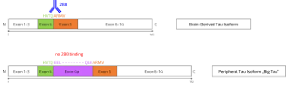 Tau is a microtubule-associated protein highly expressed in neurons, where it plays a critical role in microtubule stabilization and axonal transport. Brain-derived Tau originates from the central nervous system and reflects neuronal physiology and pathology, including neurodegenerative processes associated with tauopathies. In contrast, peripheral Tau is expressed by non-neuronal tissues and includes longer “Big-Tau” isoforms that contain the exon 4a insert, which are not representative of CNS pathology.