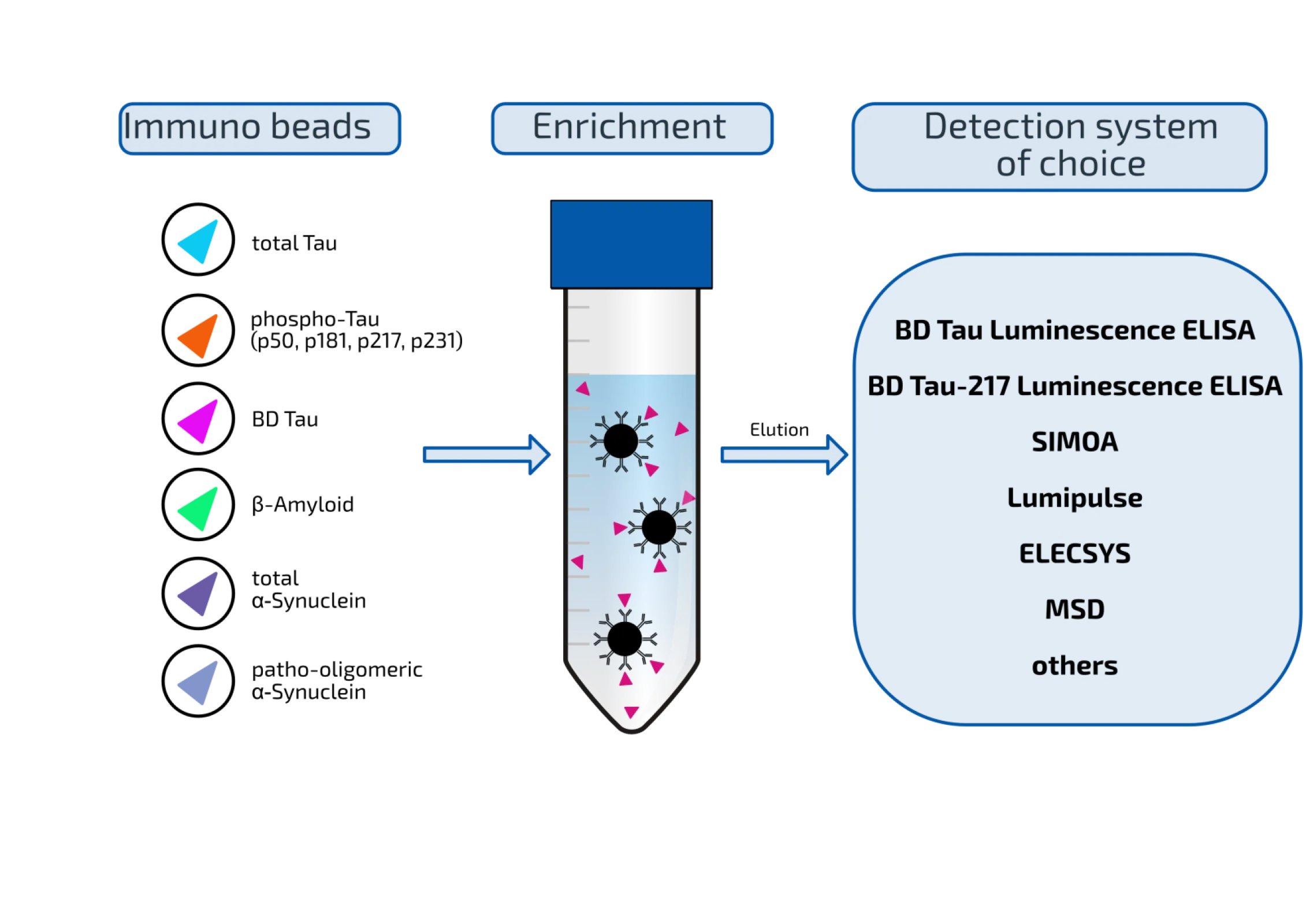Our Neuro IP Kit enables easy enrichment of the neurodegeneration-relevant proteins total Tau, different phospho-Tau´s (p50, p181, p217, p231), brain-derived Tau, beta-Amyloid (Aβ), total α-Synuclein, and patho-oligomeric α-Synuclein from plasma by immunoprecipitation. As a positive side effect, all non-specific matrix effects that can interfere with downstream analysis are eliminated. After enrichment, a detection system of choice can be applied (BD Tau LUM ELISA, BD Tau-217 LUM ELISA, SIMOA, Lumipulse, ELECSYS, MSD, ELISA).